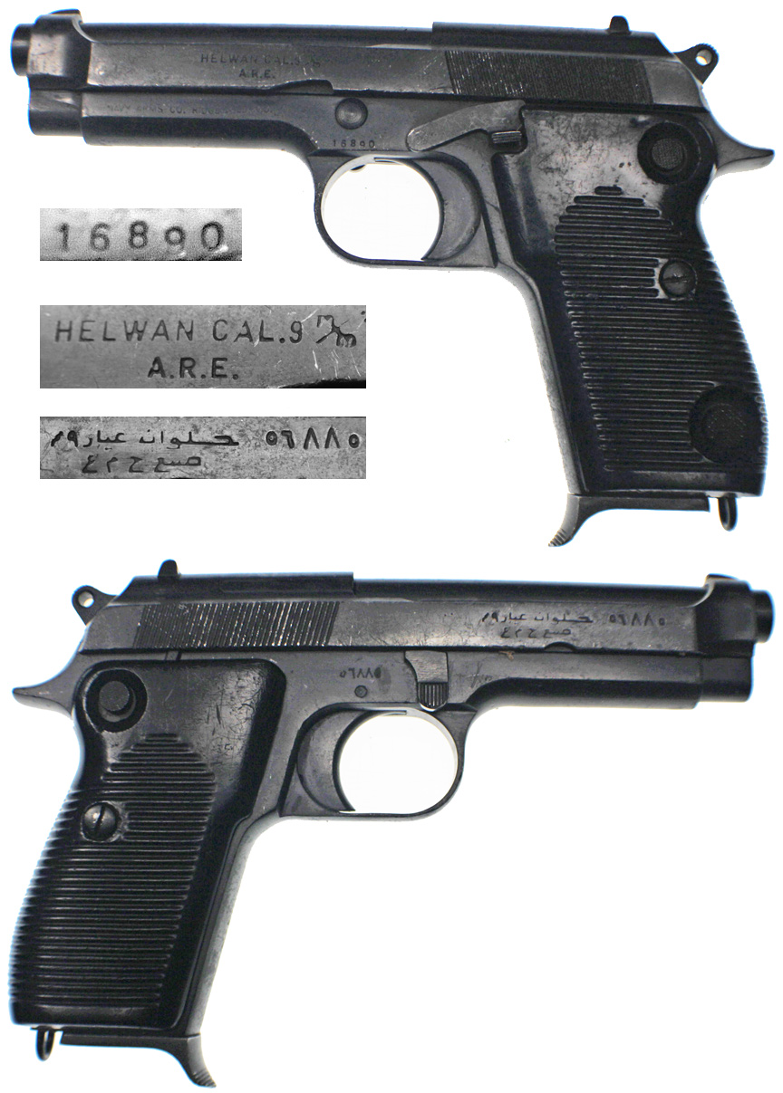 EGYPTIAN Model 52 semiautomatic pistol # 16890 (9mm) mfg. by Helwan in c.1958. A licensed copy of the Beretta 951, marked in English on the left side of the slide and Arabic on the right side. Near Excellent condition with a perfect mirror-bore, and including two eight-round finger-rest magazines and black leather full-flap holster. PHOTOS . . . $495. C&R SOLD