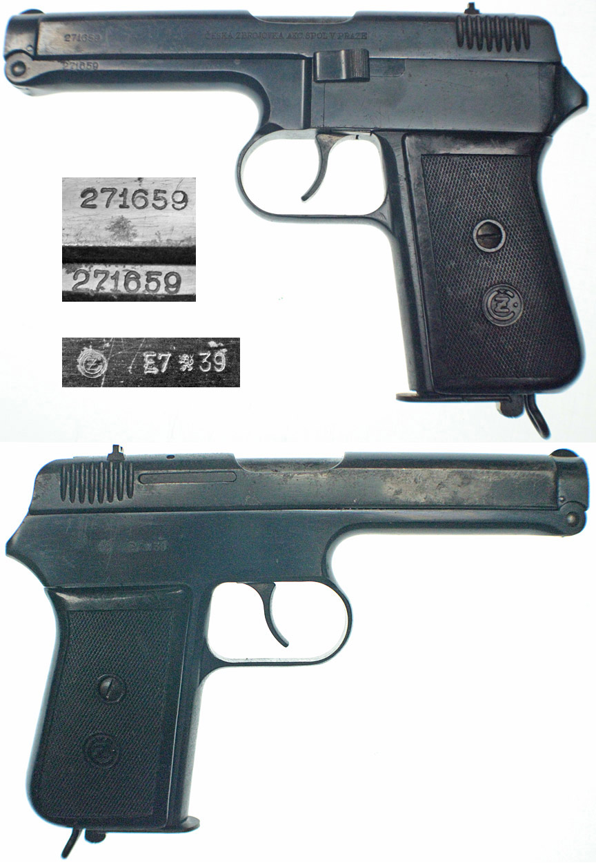 CZECH Model CZ38 semiautomatic pistol # 271659 (.380 ACP) mfg. at Ceska Zbrojovka, Prague in 1939. Near Excellent condition with 90% or so original bluing but has some scattered pitting and verdigris being "holstered wet". Bore is excellent and quite bright, markings are very sharp with E7 39 Czech military proofs tamped on right side. Nice unchipped grips are in pretty nice condition. Includes two magazines and reproduction black leather full-flap P38 holster with some bogus Waffen SS stamps on back. Not import-marked, these double-action only pistols were very popular with German Luftwaffe pilots during WWII. PHOTOS . . . $725. C&R SOLD