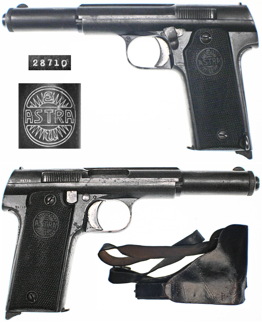 SPANISH Model 1921 semiautomatic pistol # 28710 (9x23 Largo) mfg by Astra in 1926. Good to Very Good condition, with most bluing turning brown and much scattered verdigris throughout. Bore is a bit grainy with strong rifling. Includes two magazines and correc t black leather shoulder holster that fastens at the bottom. Not import marked.. PHOTOS . . . $450. C&R
