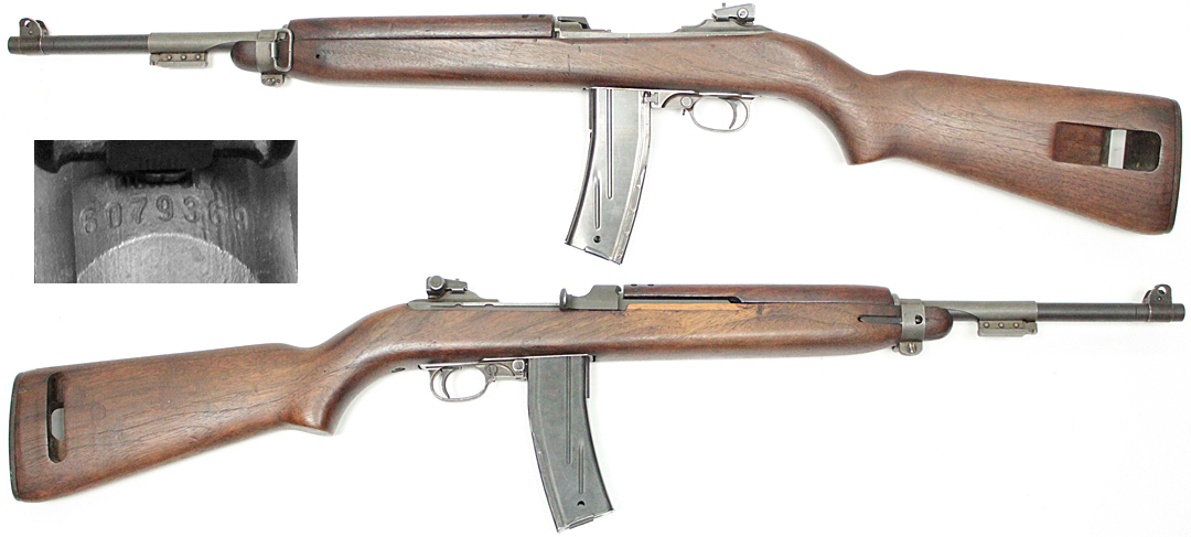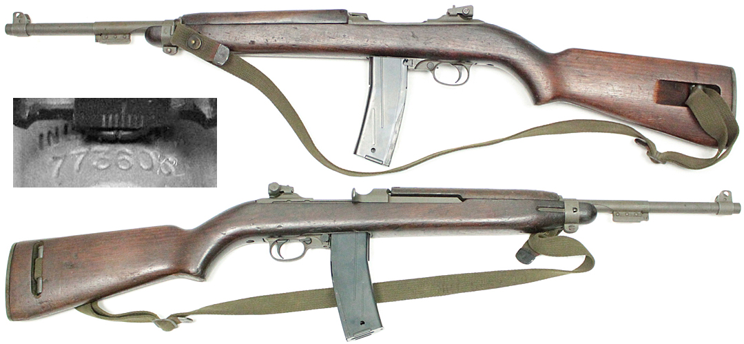 U.S.A. Model M1 Carbine semiautomatic rifle rig # 773606 (.30 Carbine) mfg. by Inland Division of General Motors in Late 1943 with 7-43 dated Inland barrel. Excellent condition, metal has mostly full Parkerized finish with a mirror bright bore and with 1.0 muzzle-wear. This features a flat-topped bolt, flip-type safety, M-marked magazine release, adjustable rear sight and late front band with bayonet-lug. Low-wood walnut stock and handguard has some handling marks. Includes one 30-round unmarked magazine (only where legal) and a web sling with oiler. Not import-marked. PHOTOS . . . $1475. C&RU.S.A. Model M1 Carbine semiautomatic rifle rig # 6079369 (.30 Carbine) mfg. by Rock-Ola in Spring 1944 with 3-44 dated Inland barrel. Excellent condition, metal has mostly full Parkerized finish with a mirror bright bore and with 1.0 muzzle-wear. This features a flat-topped bolt, flip-type safety, M-marked magazine release, adjustable rear sight and late front band with bayonet-lug. High-wood walnut stock and handguard has some handling marks. Includes one 30-round unmarked magazine (only where legal). Is import-marked (but not a Blue Sky). PHOTOS . . . $1250. C&R SOLD