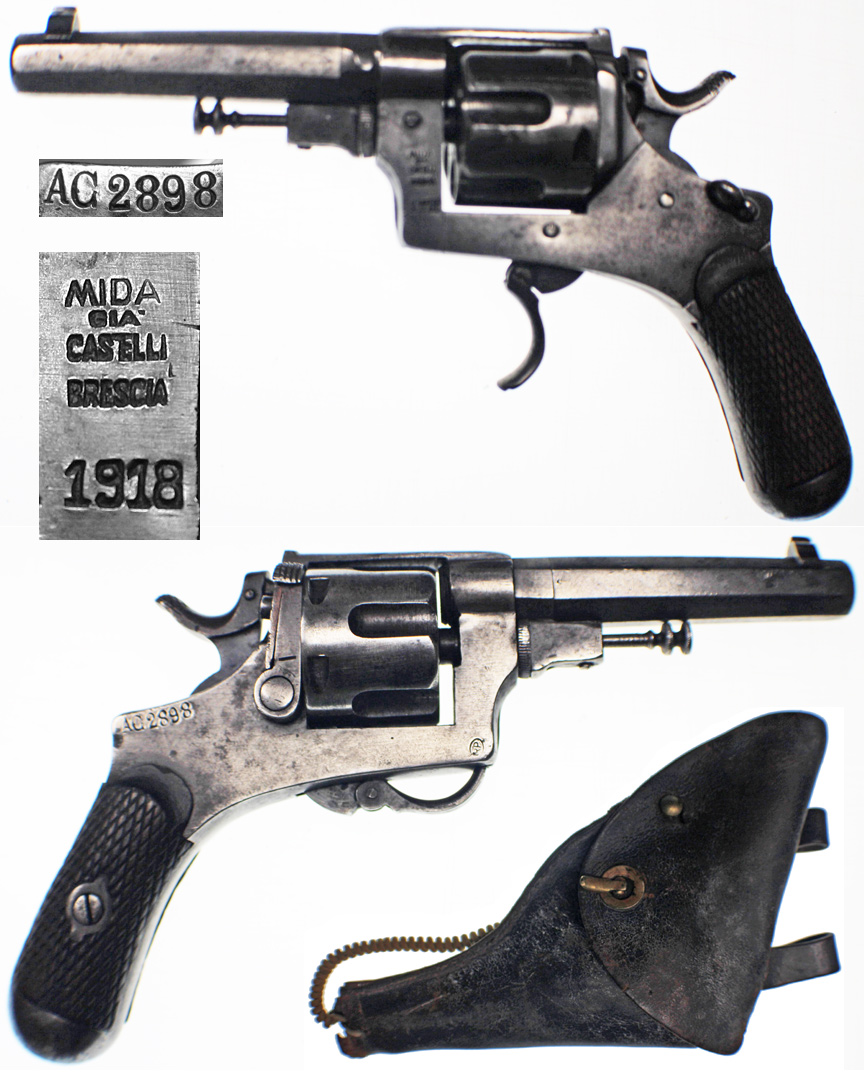 ITALIAN Model 1889 Bodeo revolver # AC2898 (10.35 Italian) mfg. by Castelli in 1918. Good or better condition with little remaining finish but is completely functional. This type features a folding trigger and has a very limp thin leather holster. Bore is shockingly bright and very strong, missing lanyard ring. Not import-marked, not very attractive. PHOTOS . . . $325. C&R