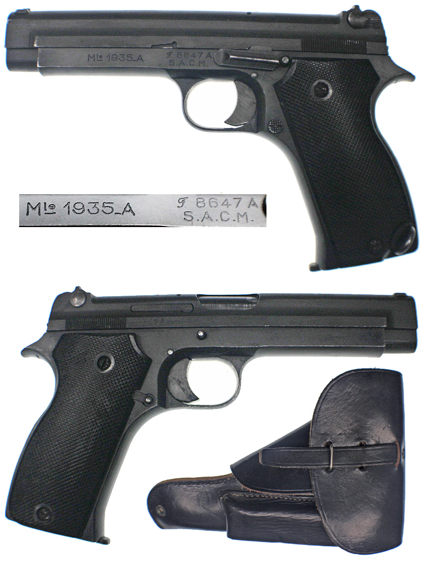 FRENCH Model 1935A semiautomatic pistol # F8647A (7.65 French Longue) mfg. by Société Alsacienne de Construction Mécaniques in late 1940's. Excellent or better with 98% military finish. Bore is gorgeous and mirror-bright, includes two magazines and full-flap black leather holster and lanyard. Not import-marked. PHOTOS . . . $725. C&R