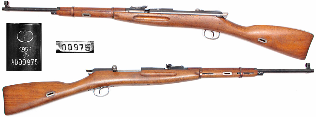 FINN Model 96B Mauser bolt-action rifle # 475681 (6.5x55), mfg. by Carl Gustaf in 1919 with straight bolt and threaded muzzle with scewed-on matal muzzle-cap, [SA] stamped on left side of receiver. Near Excellent condition, with 85% or better strong bluing on all metal parts. Has strong markings and a bright and strong bore (disk marked 6.50/1). All visible parts numbered 681 except cleaning rod (which almost never match, as they were swapped around quite a bit). Beech stock & handguard has a few handling marks but is otherwise sound. Includes new tan leather sling. PHOTOS . . . $950. C&R