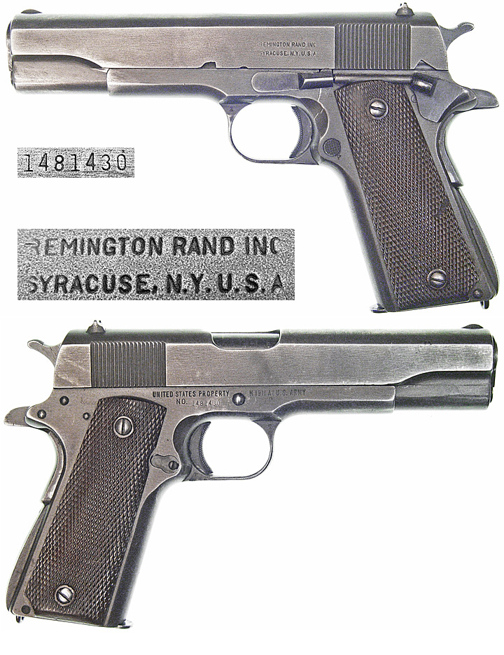U.S.A. Model 1911A1 ARMY semiautomatic pistol # 1481430 (.45 ACP), mfg. by Remington Rand in 1944. Excellent or so condition, with mostly full Parkerized finish having only some light holster-wear. Barrel has an excellent-plus bore and is mirror-bright. Has really sharp checkered plastic grips. Includes decent 7-round magazine. Extremely attractive, not import marked. PHOTO. . . $1050. C&R SOLD