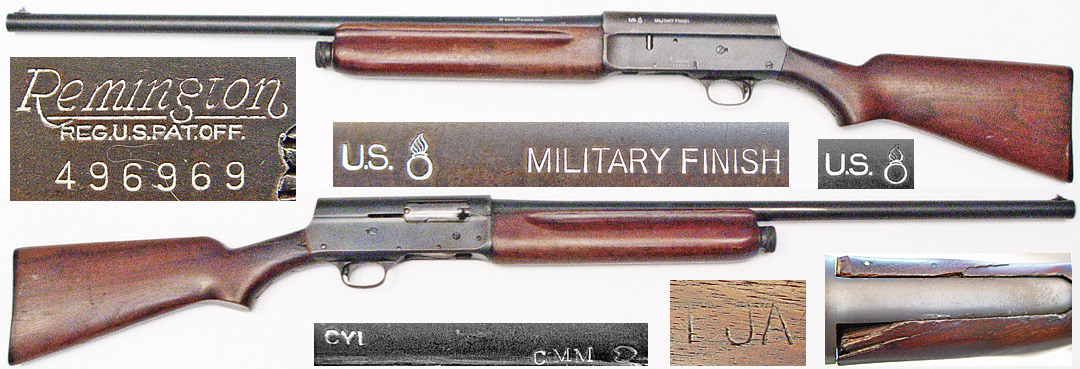 U.S.A. Model 11A MILITARY SHOTGUN semiautomatic 12 gauge # 496969 mfg. by Remington in 1940. Very Good or so condition, with 60% dull military blued finish with some worn areas. 26" barrel with a gorgeous mirror-bore, totally functional, with doubtless authentic U.S. military markings on the metal. Buttstock has clear FJA cartouche on the left side. The buttstock has some issues with cracking where it meets the receiver, and should be replaced before firing. Not import-marked, scarce, and still a desirable example of what is likely a military trainer. PHOTOS . . . $875. C&R