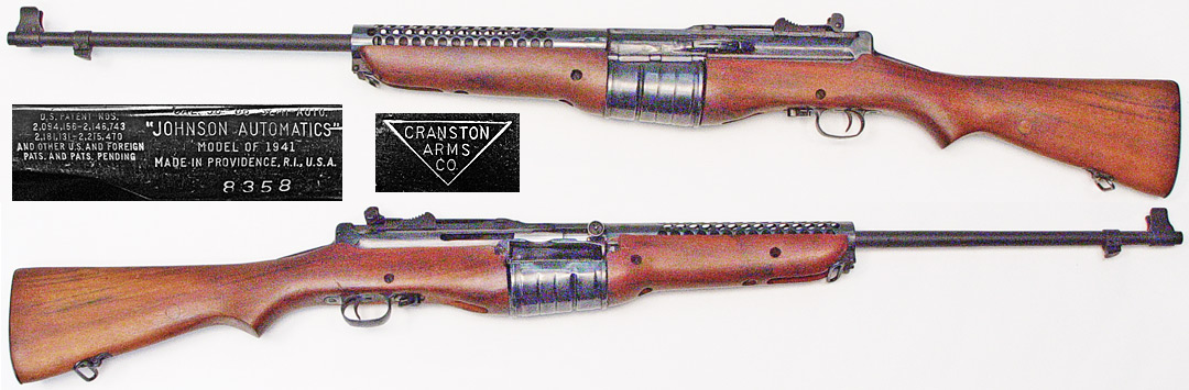 U.S.A. Model of 1941 Johnson semiautomatic rifle # 8358 (.30-06) mfg. by Cranston Arms Co. in 1941. Excellent condition, but action has been professionally blued and has a beautiful high-gloss finish. This rifle has a gorgeous mirror-bore. Bolt not matching (#7018) which is usual for these, stock is in great condition with original finish. Not import-marked, very scarce, and quite an attractive (and superbly accurate) example. PHOTOS . . . $5250. C&R SOLD