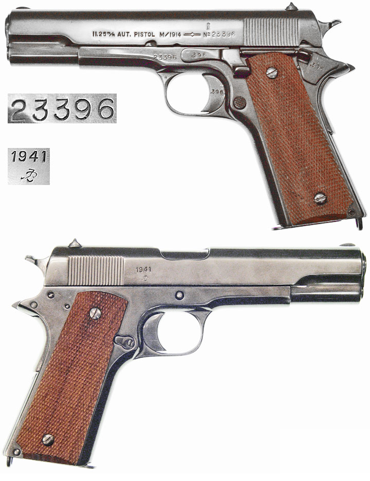 NORWEGIAN Model 1914 semiautomatic pistol # 23396 (.45 ACP), mfg. by Kongsberg Arsenal in 1941. Excellent or better REFINISHED condition, with full bluing remaining. All matching serial numbers (and every piece, except for magazine, is numbered). Barrel is mirror-bright and very strong. Has sharp checkered walnut grips. Includes like new 7-round magazine. Extremely attractive, not import marked. This pistol was produced only a few weeks before the Nazis invaded Norway. PHOTO. . . $950. C&R SOLD