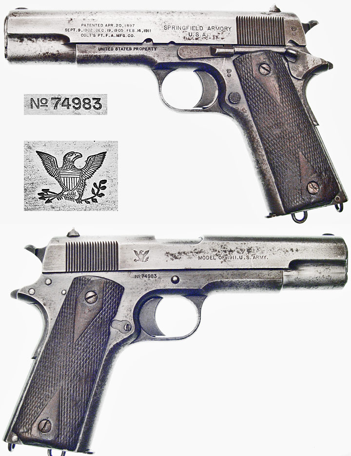 U.S.A. Model 1911 ARMY semiautomatic pistol # 74983 (.45 ACP), mfg. by Springfield Armory in 1914. Good or better condition, with virtually no finish remaining, but very strong markings and a short, stubby Type 1 hammer. Barrel has some light pitting in the grooves, slide has really well defined Springfield eagle and markings. Grips have double-diamond motif and are quite worn. Includes average two-tone 7-round correct Springfield magazine. Not import marked, scarce to rare. PHOTO. . . $1600. C&R SOLD