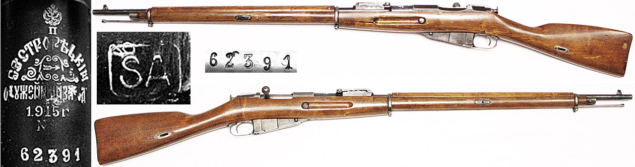 FINN Model 1891 Mosin-Nagant bolt-action infantry rifle # 62391 (7.62x54R) mfg. by Sestroryetsk in 1915 with [SA] Finn property mark on left side of barrel-shank. Very Good PLUS condition, with much bluing on all metal parts and a mostly bright bore with strong rifling. Bolt body stamped 62391 (matching), very strong markings on barrel. Two-piece Finn stock has been sanded and finished in what appears to be polyurethane. Includes cleaning rod. PHOTOS . . . $400. C&R