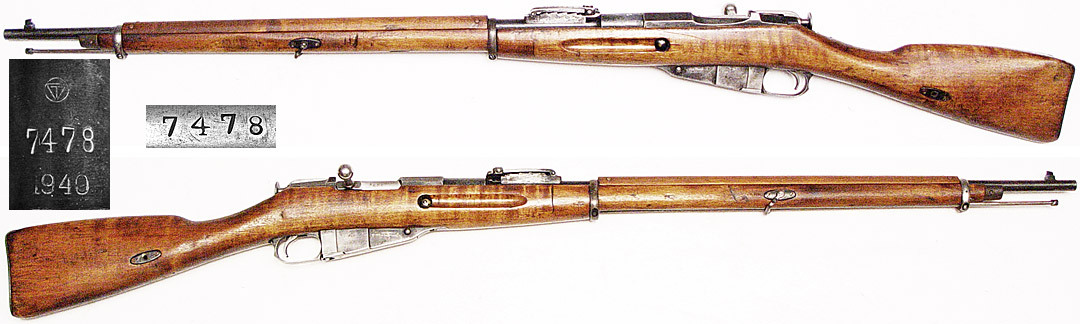FINN Model 91 Mosin-Nagant bolt-action infantry rifle # 7478 (7.62x54R) barrel mfg. by Tikka in 1940 on a 1901 fated Izhevsk receiver. Very Good condition with most bluing on all metal parts and a very bright bore (has NOT been counterbored at muzzle). Bolt-body numbered 7478 (matching), remainder of numbered parts scrubbed (as usual). Two-piece Finn stock has very few handling marks as it was certainly refinished quite nicely. Includes cleaning rod. PHOTOS . . . $475. C&R