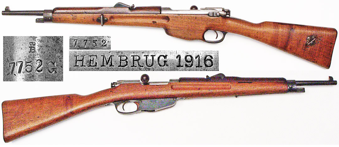 DUTCH Model 1895 No.4 Old Model Mannlicher bolt-action carbine # 7752G (6.5x53R) mfg. by Hembrug in 1916 with sling swivels on left side and a shorter handguard. Very Good condition, with 70% bluing (receiver in the white, which is proper for these). All matching serial numbers, bore is strong and quite bright. Stock is walnut with subtle tigerstriped figure and has many handling marks from actual use over the last 103 years, a 1" or so chip on right side by handguard. Includes wood panel on left side of magazine, but missing cleaning rod. Not import-marked, only 18,000 manufactured. PHOTOS . . . $525. C&R