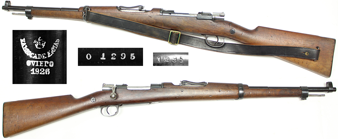 SPANISH Model 1916 bolt-action short rifle # O1295 (7x57) mfg. by Oviedo in 1926 with "roller-coaster" type tangent rear sight. Excellent condition with no appreciable wear. All numbered parts (including bolt and stock) numbered 1295 (matching). Has a somewhat frosted but bright bore, stock has very few handling marks. Not import marked, very unusual. PHOTOS . . . $575. C&R SOLD