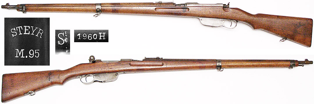 AUSTRIAN Model 1895 Mannlicher straight-pull bolt-action long rifle # 1960H (8x56R) mfg. by Steyr in 1917. Very Good condition, original refinish with very faded bluing. Bore is very strong and mirror-bright. Bolt-knob stamped 1960, stock not matching. Buttstock has many handling marks, but is sound. Not import-marked. PHOTOS . . . $425. C&R SOLD