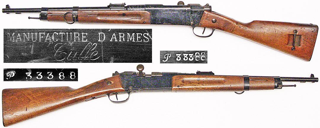FRENCH Model 1886 R35 Lebel bolt-action cartridge carbine # P33388 (8x50R) mfg. by Tulle before 1890, with 1939 dated Châtellerault replacement barrel (with N-marked chamber). Excellent condition, mostly full remaining (but chipping) black enamel finish on metal parts. All matching serial numbers (including wood). Bore is nearly perfect and mirror bright, stock has some of the expected dings and handlling marks but is sound had not been sanded. Not import marked. PHOTOS . . . $625. Antique, no FFL required SOLD