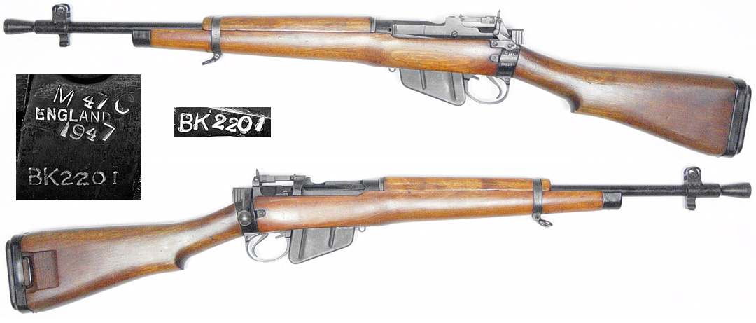 BRITISH Model No.5 Mk.1 Enfield bolt-action "Jungle Carbine" # BK2201 (.303 British) mfg. at B.S.A. Shirley in 1947. Excellent condition, with 95% enamel finish. Bolt and forend numbered to receiver, magazine not numbered. Has very strong and bright 5-groove bore and 0-marked bolt-head. Stock and handguard has very few handling marks. Not import-marked. PHOTOS . . . $825. C&R SOLD