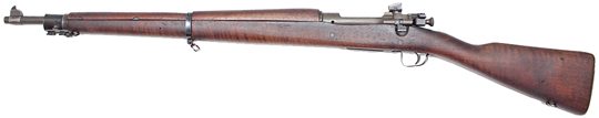 U.S.A. Model 1903 Springfield bolt-action rifle # 382043 (.30-06) mfg. by Rock Island Arsenal in 1920. Near Excellent condition with 85% deep bluing on all metal. A very nice example with bright and strong 12-18 dated RIA (Rock Island Arsenal) four-groove barrel. Bore is excellent and mirror-bright (TE = 3.5, MW = 1.5), bolt has straight handle. Walnut fingergroove stock has original finish with some wear from actual use, includes leather Model 1905 sling. Not import-marked.